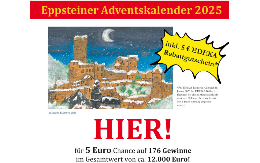 Jeder Kalender gilt einmalig vom 1. bis 31. Januar 2026 bei einem Einkauf bei EDEKA Baßler in Eppstein im Wert von mindestens 50 Euro als Gutschein in Höhe von 5 Euro!